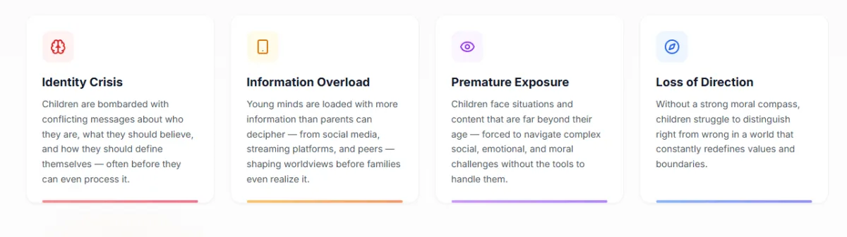 Through Bible stories, animated cartoons, practical life applications, and open discussions, we help children understand their true identity in Christ. We address real topics like bullying, peer pressure, screen addiction, self-worth, and responsibility — all through the lens of God's Word. We give children a firm foundation so they can process the overwhelming information the world throws at them and know who they truly are.