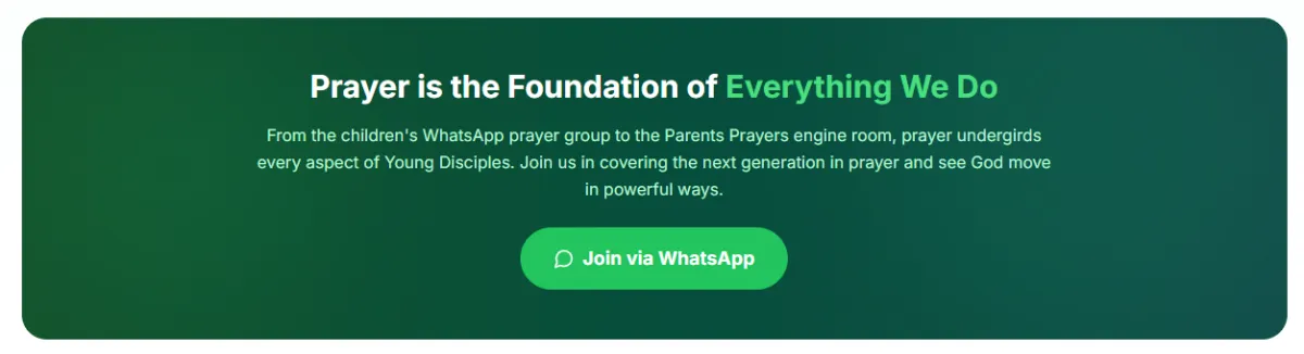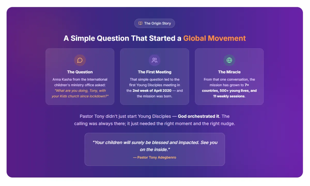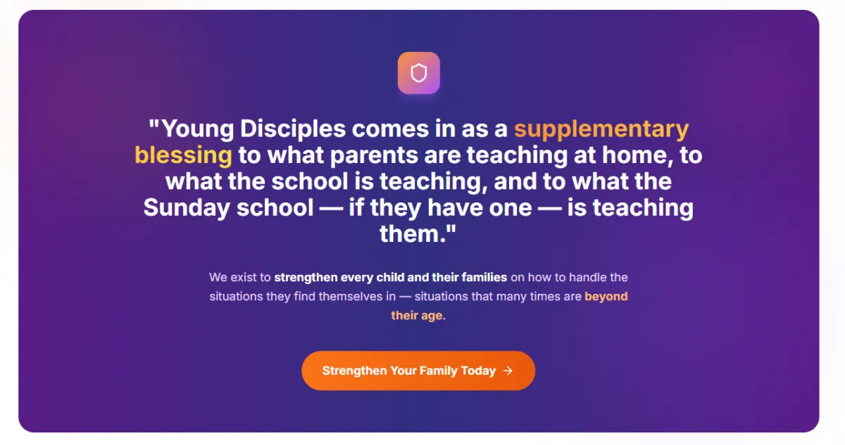 We live in an age of turbulence where children face an unprecedented identity crisis. Their young minds are loaded with information that even parents struggle to decipher from social media, peers, and a rapidly changing world. Many situations they encounter are far beyond their age. Young Disciples comes in as a supplementary blessing to what parents teach at home, what schools teach, and what Sunday school teaches — strengthening every child and their families on how to handle these challenges through God's Word.