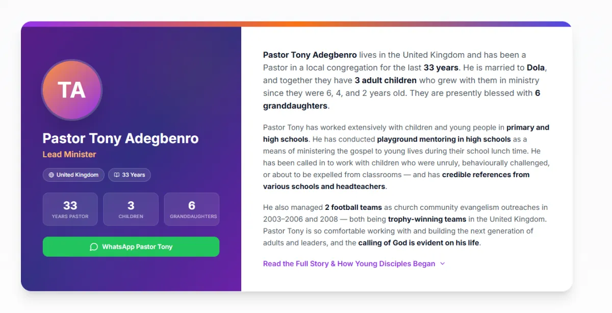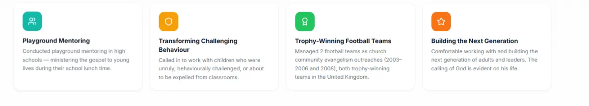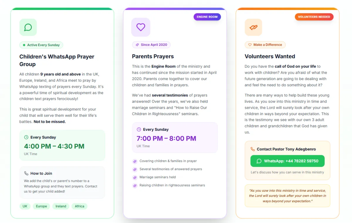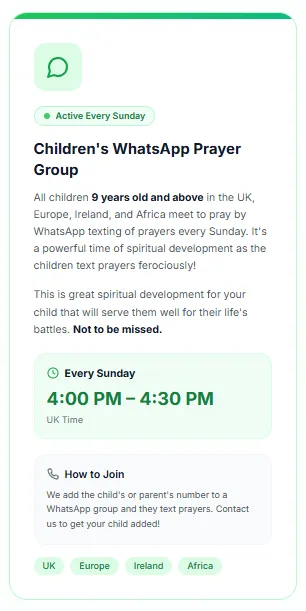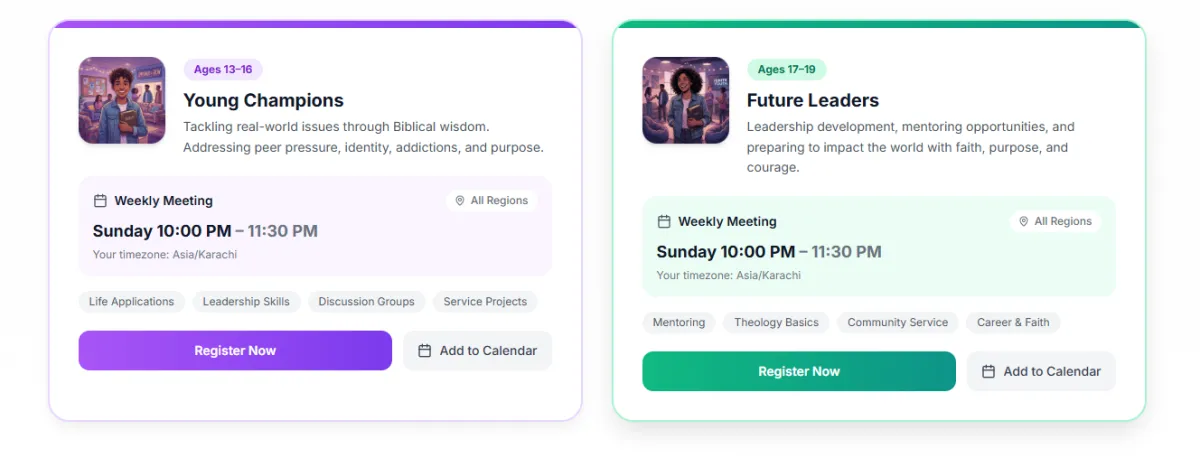 We serve children and young people ages 5 to 19, divided into four groups: Little Lambs (5-8), Growing Warriors (9-12), Young Champions (13-16), and Future Leaders (17-19). Each group receives age-appropriate teaching, activities, and discussion topics tailored to the challenges they face at their stage of life.