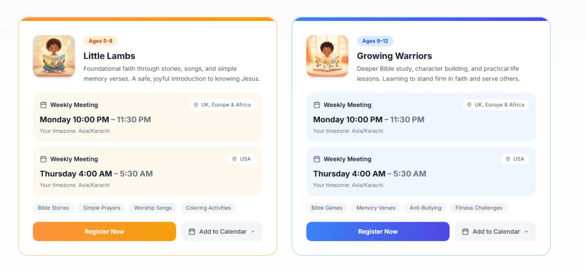 Sessions are held weekly at different times to accommodate families across multiple time zones including USA, UK, Ireland, Germany, India, and Africa. Use our time zone converter in the Age Groups section above to see the exact times in your local timezone. Each session lasts approximately 60-90 minutes.